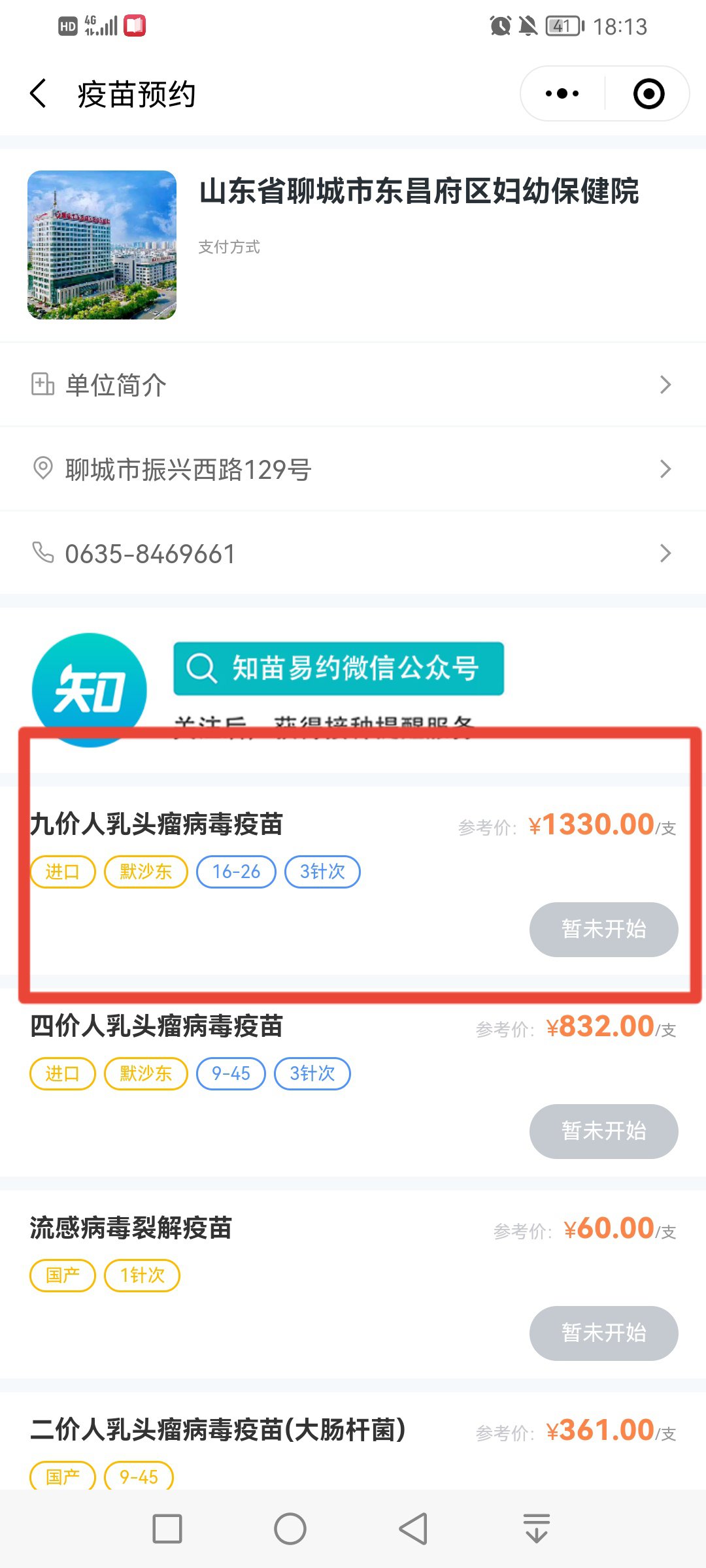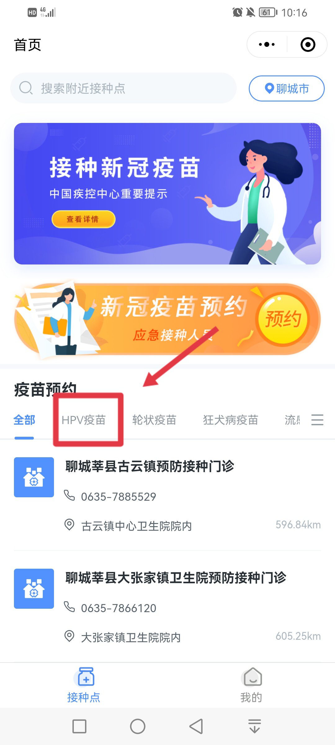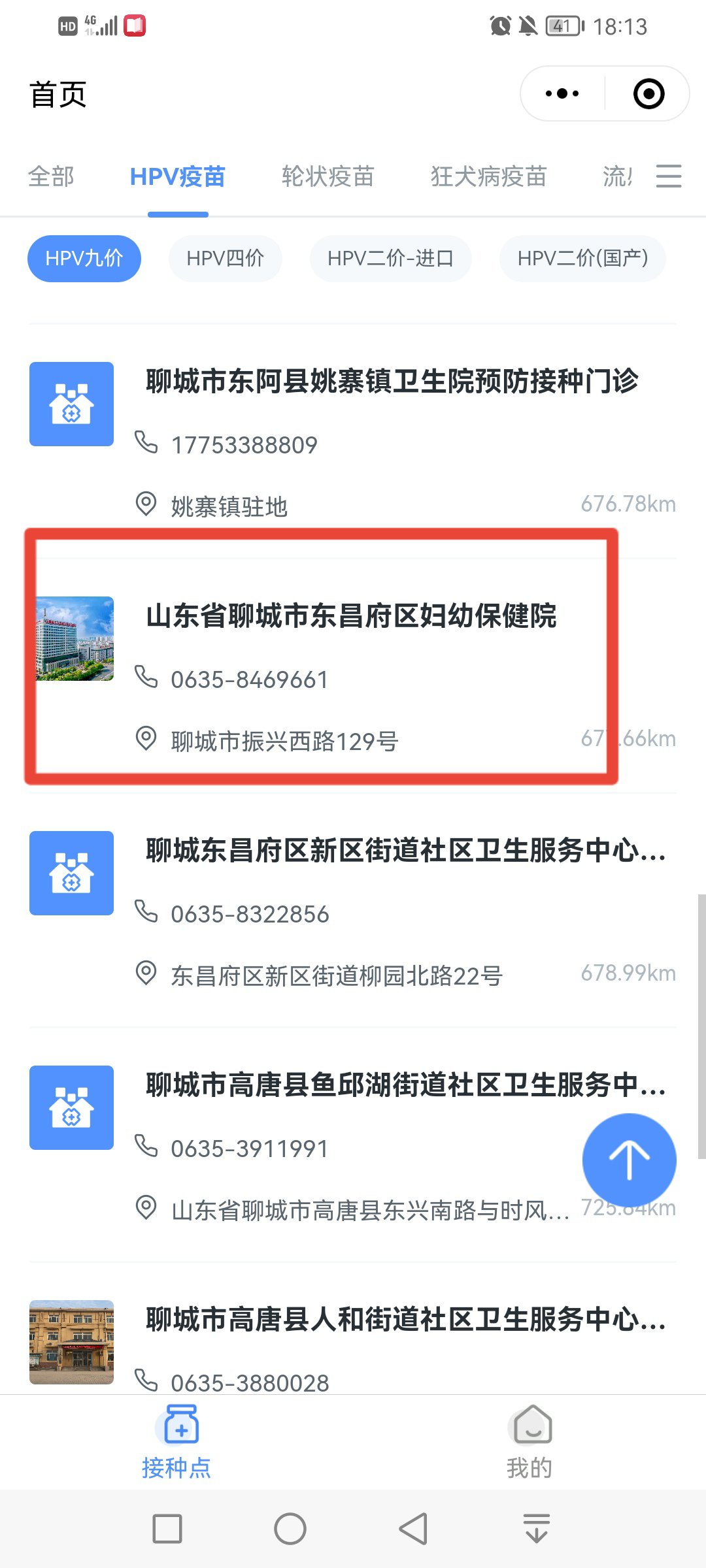 3、进入页面后点击【HPV九价】,聊城各个九价疫苗接种点信息会显示出来