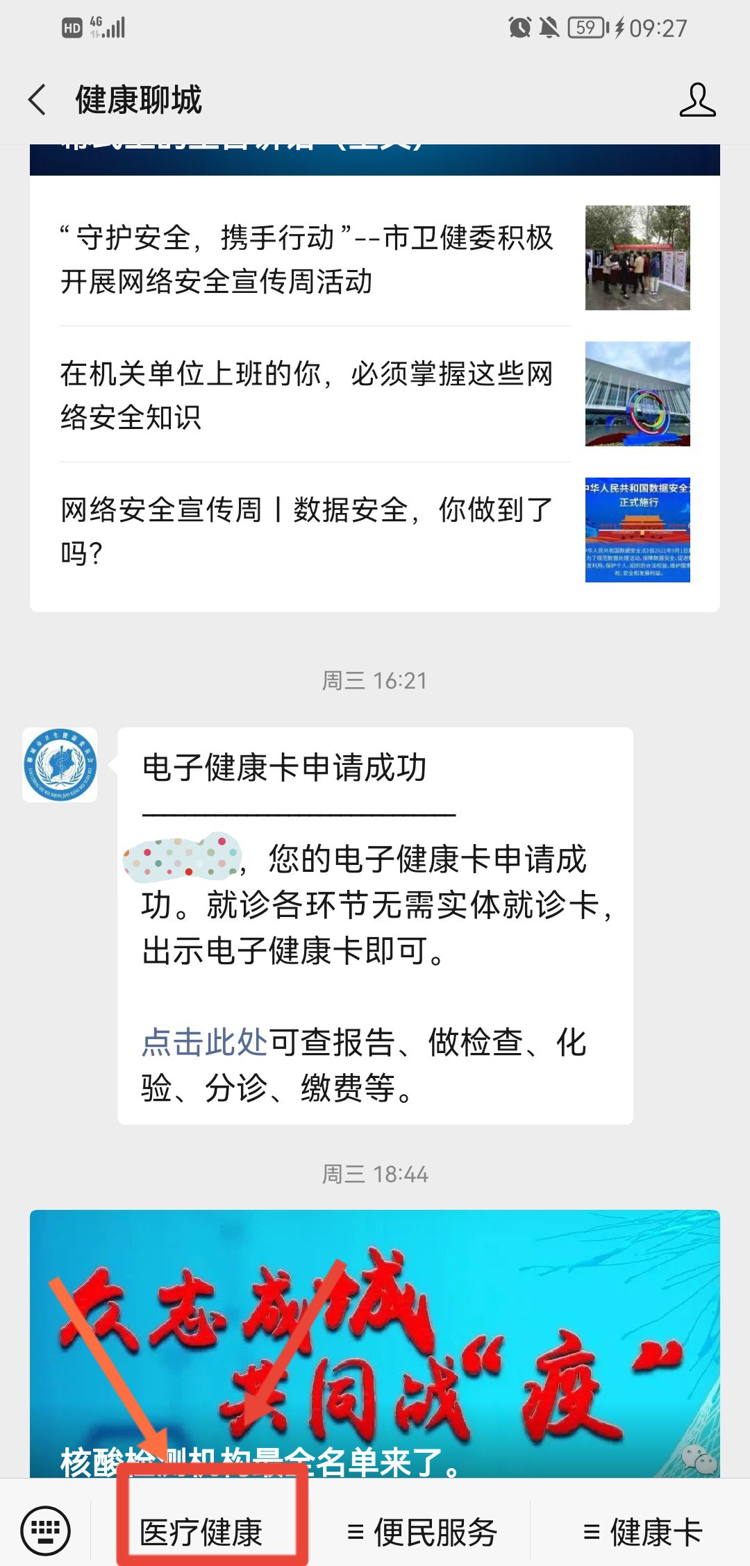 2、点击公众号下方菜单栏,点击【医疗健康】进入服务页面