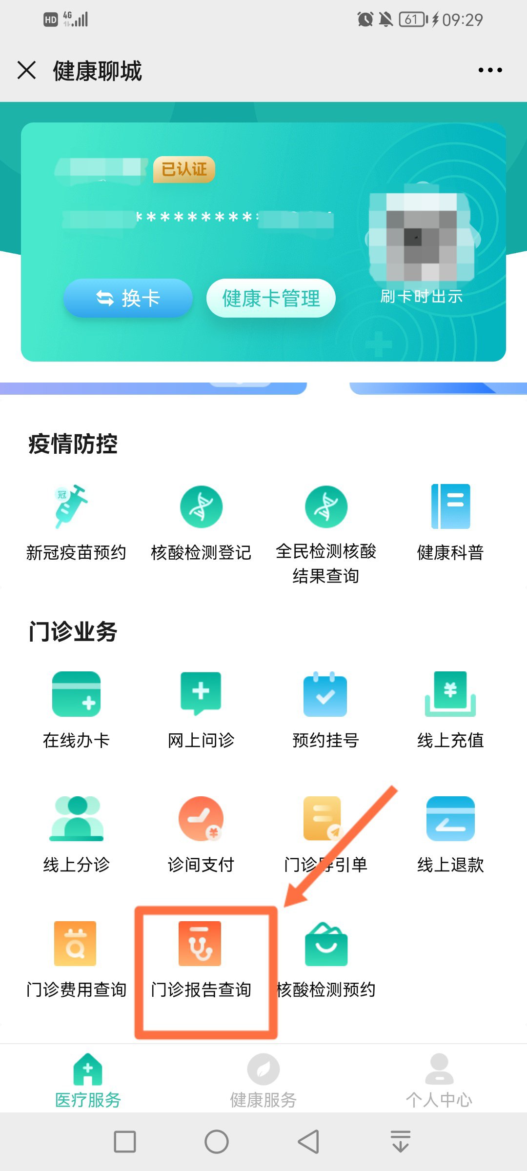 2、点击公众号下方菜单栏,点击【医疗健康】进入服务页面