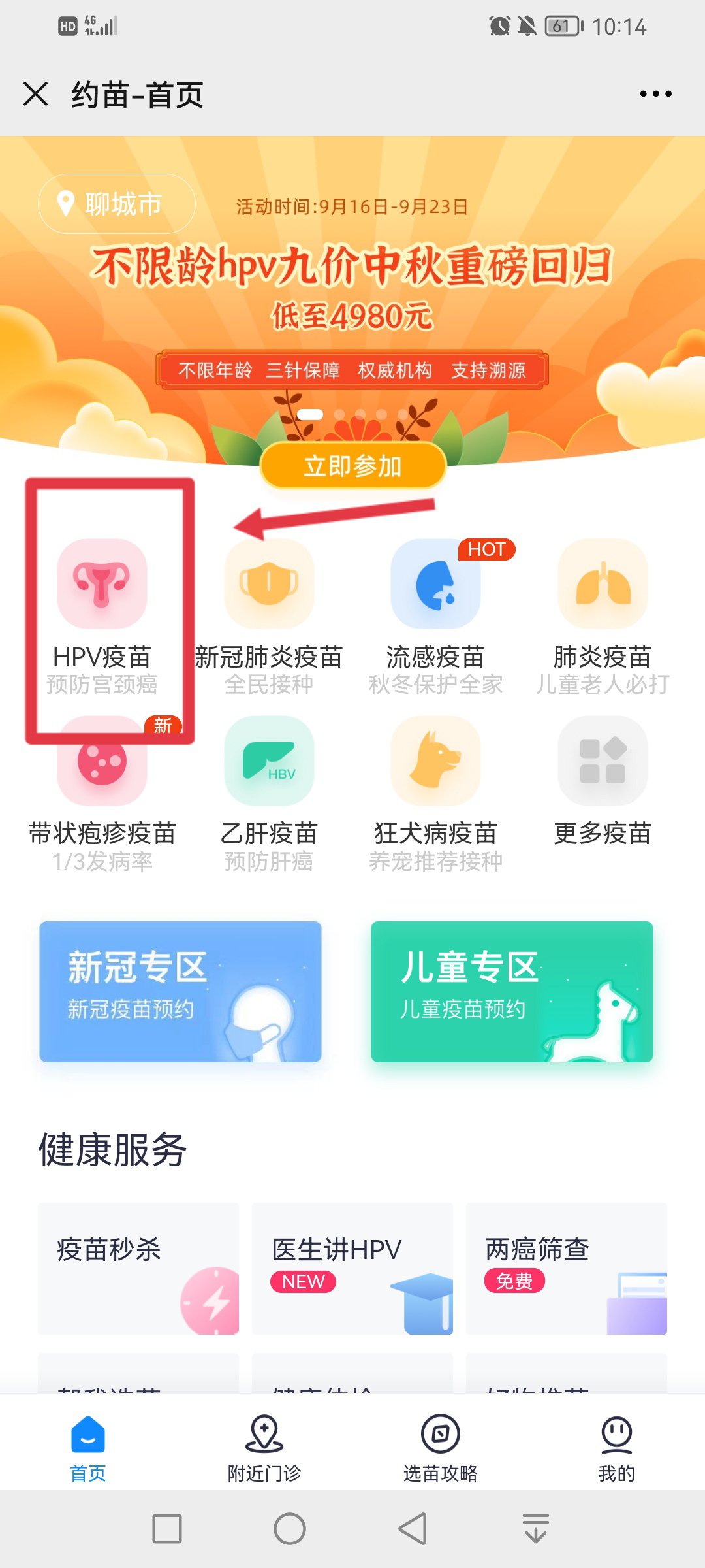 3、进入页面后点击【HPV疫苗】,进入页面