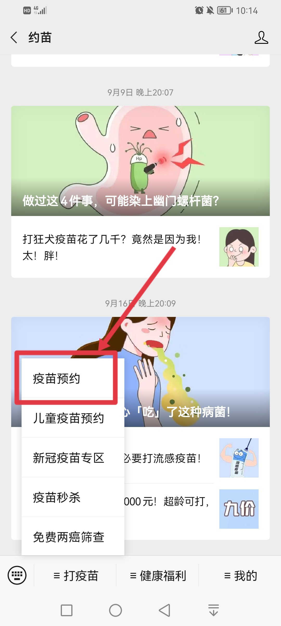 2、点击菜单栏【打疫苗】,选择【疫苗预约】