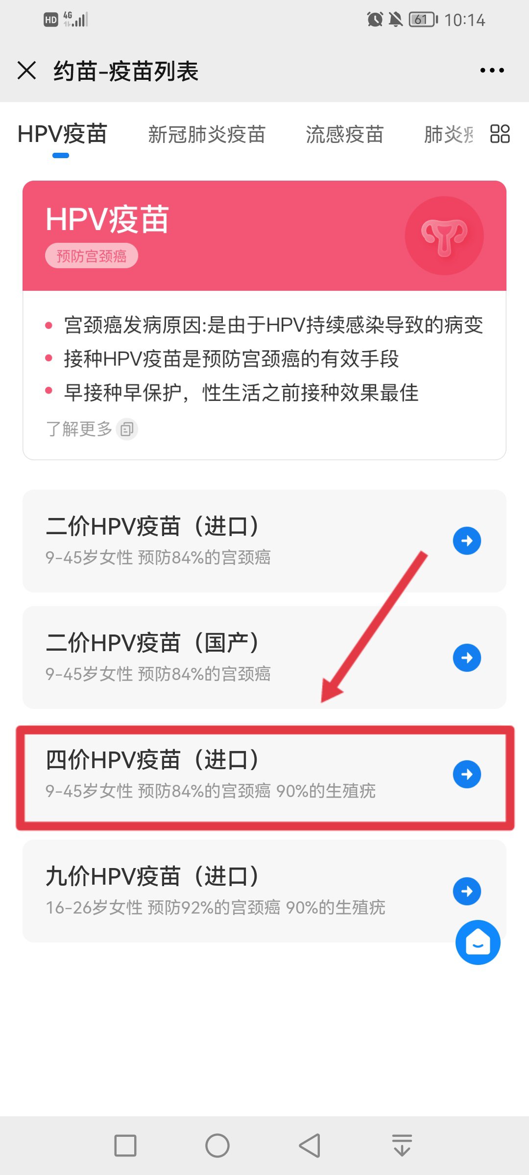 3、进入页面后点击【HPV四价】,
