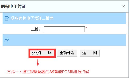 方式一:通过A9智能POS机进行扫码。点击【pos扫码】按钮,再点击A9智能POS机屏幕上出现的“扫一扫”按钮,并将参保人医保电子凭证二维码置于POS机摄像头上方进行扫码,扫码后会听到“叮”的一声表示扫码成功。