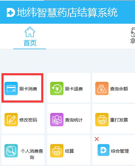 (一)参保人使用医保电子凭证支付结算时,定点药店、门诊在地纬智慧药店结算系统的首页中,点击【刷卡消费】按钮,如图: