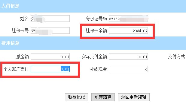 (七)结算后弹出收费确认页面,操作员核对“社保卡余额”和“个人账户支付”金额是否正确。