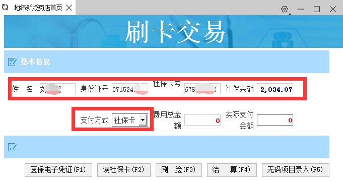 (四)扫码成功后,系统自动调取参保人的姓名、身份证号码、社保卡号、社保卡余额等信息,支付方式默认【社保卡】即可,如图: