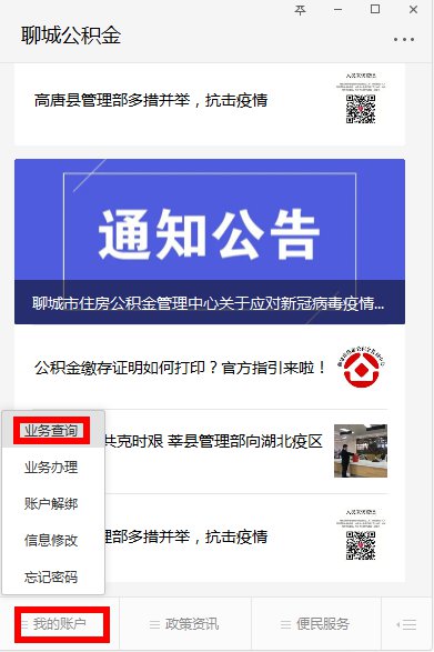 (1)在微信中登录“聊城公积金”,点击“我的账户”,“业务查询”页面查询。