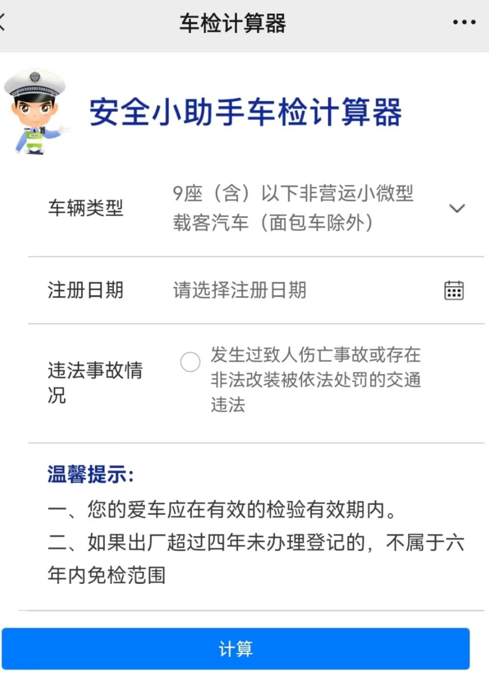 2.进入填写车辆类型、注册日期、违法事故情况信息,填写完毕点击计算