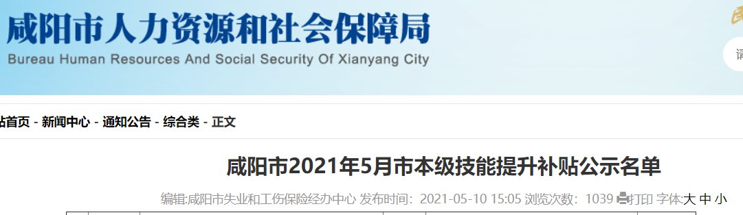 咸阳市2021年5月市本级技能提升补贴公示名单