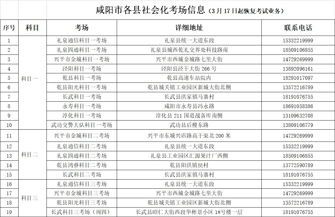 三、部分小型机动车驾驶人考试业务(包含科目一、科目二、科目三)。具体考场见附表。