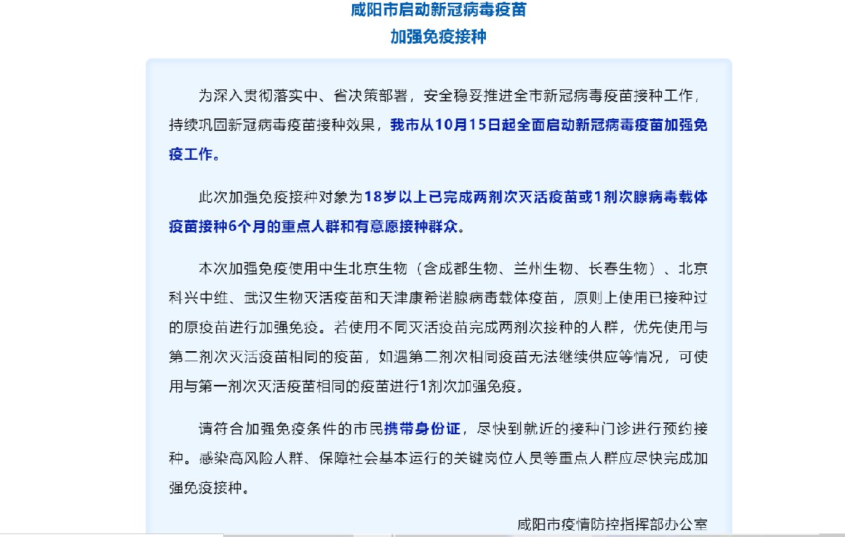 咸阳市从10月15日起全面启动新冠病毒疫苗加强免疫工作。