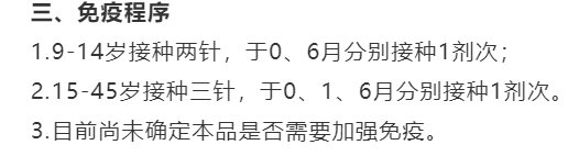 2.15-45岁接种三针,于0、1、6月分别接种1剂次。