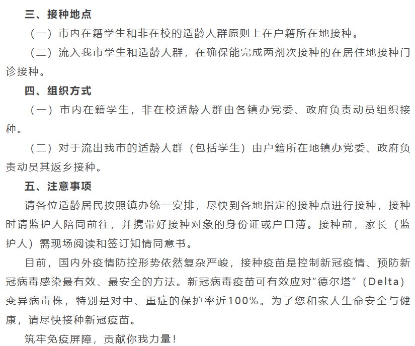 请各位适龄居民按照镇办统一安排,尽快到各地指定的接种点进行接种,接种时请监护人陪同前往,并携带好接种对象的身份证或户口薄。接种前,家长(监护人)需现场阅读和签订知情同意书。