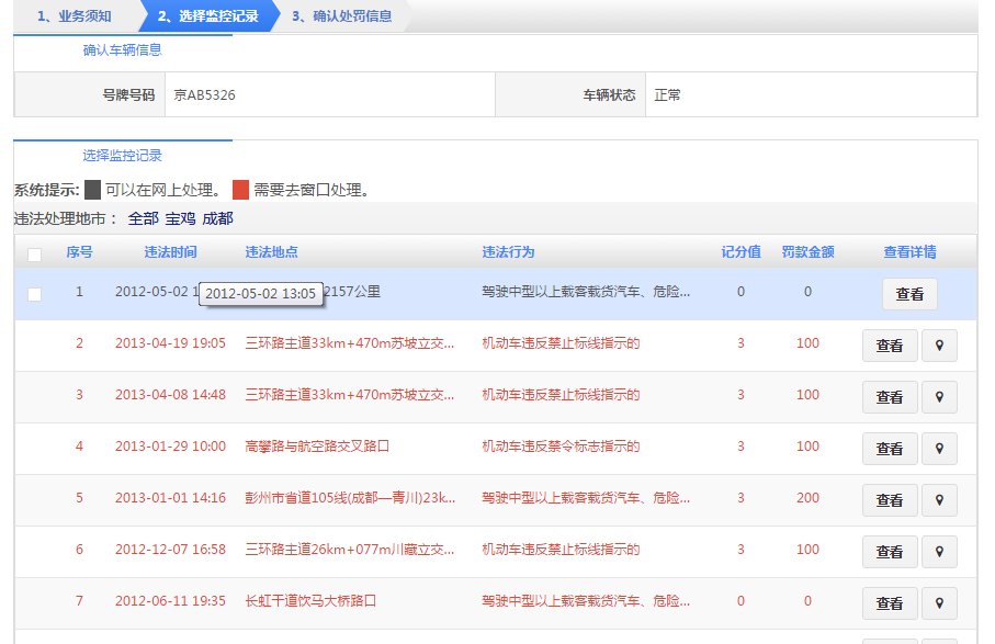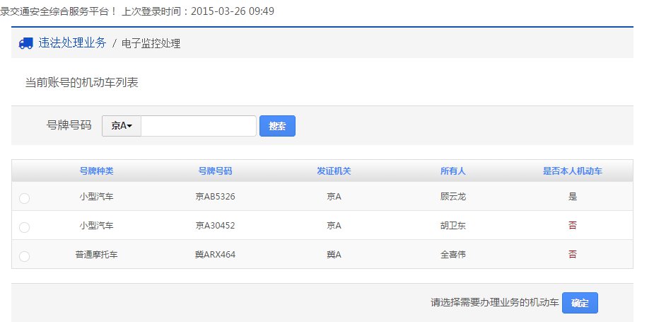在该步骤,选择需要处理电子监控的机动车,界面如下图所示: