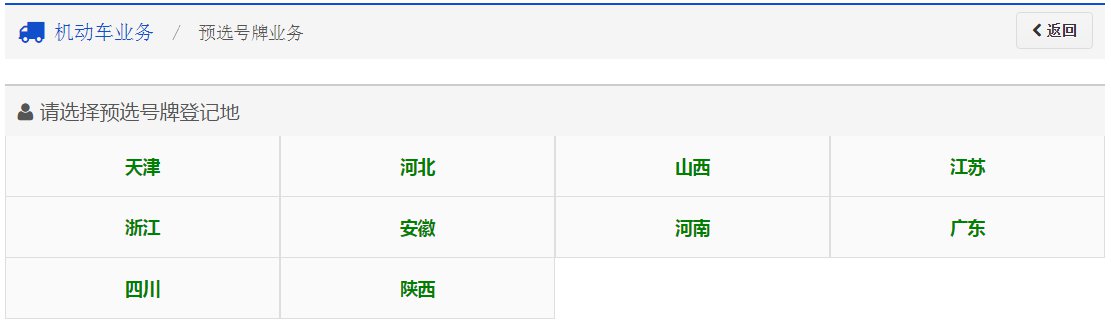 点击预选号牌服务说明页面中红色标示的“跳转到其他省市”链接,进入全国省市互联网服务平台选择界面。 用户根据本人新购二手普通小型汽车需要上牌的车管所选择相应的省市,系统会自动跳转到用户选择的省市互联网服务平台的预选号牌首页。如下图所示:
