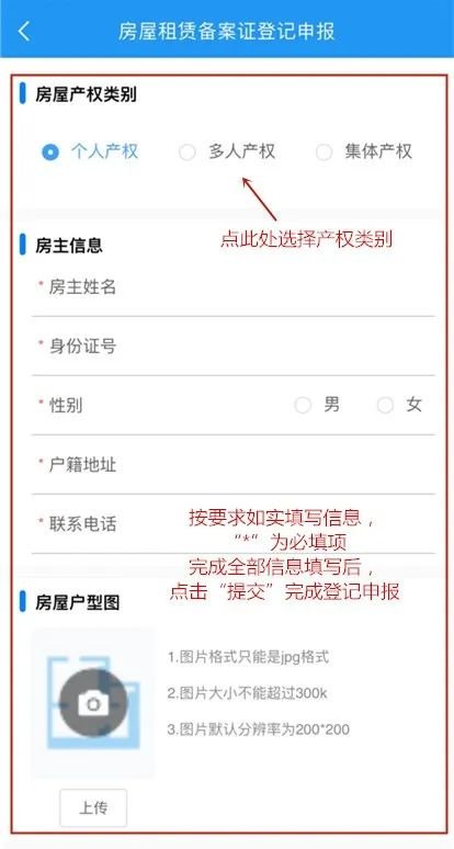 房屋租赁备案登记申报:按要求如实填写信息,“*” 为必填项信息填写完成后,点击“提交”完成上报。