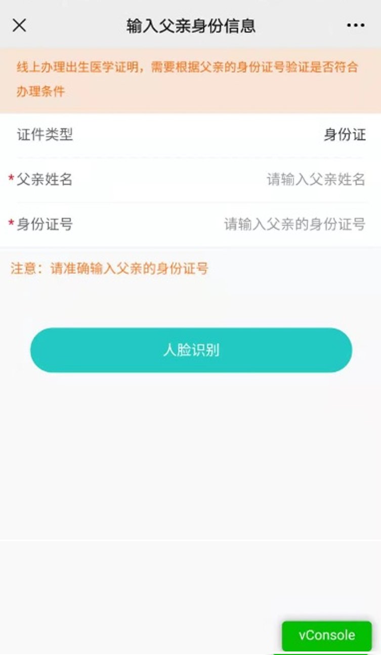手动输入父亲姓名和身份证号点击“人脸识别”(分娩记录里面的身份证号,人脸识别输入的身份证号,保持一致)