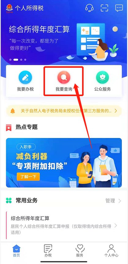 ②点击[我要查询]进入个人所得税。