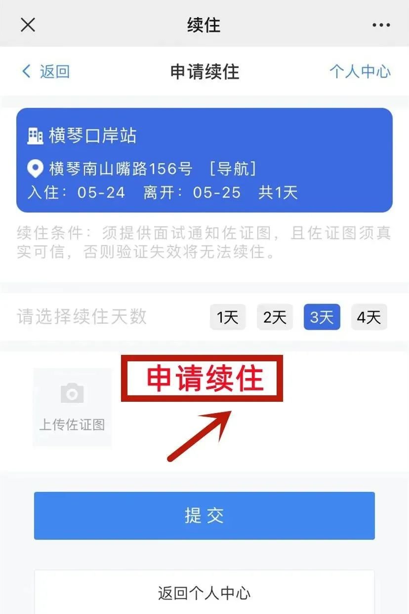 成功申请者首次获批的入住时间不超过2天 ,如因求职原因,需延长住宿时间,应在退房前凭3日内的相关求职证明 ,通过“珠海青年人才驿站”微信公众号,进入菜单栏,依次点击“驿站详情”-“我的”-“续住任务”或“我的住宿”,跳转到续住页面,提交延期住宿申请 。