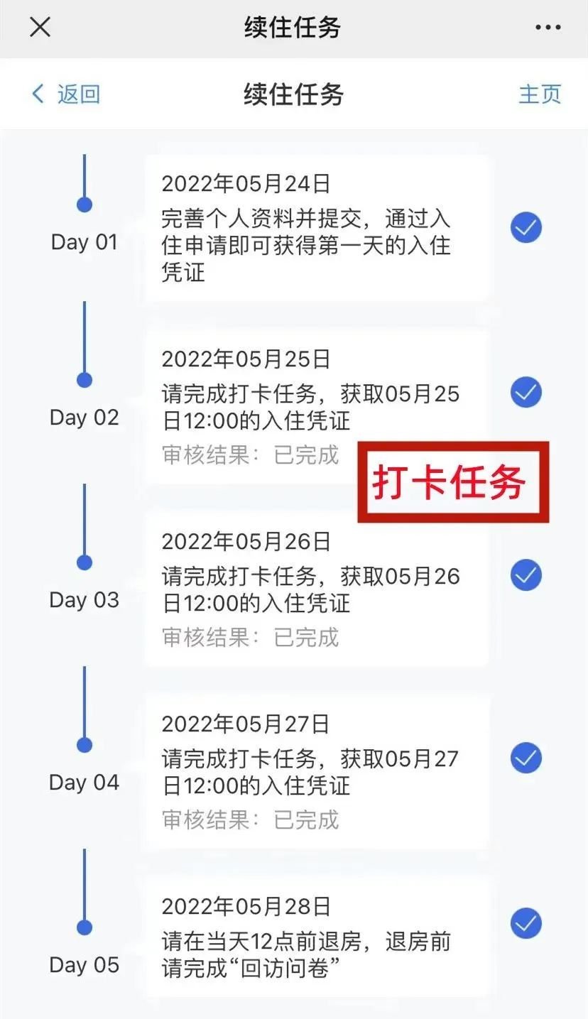每位申请者最多可申请延期1次,累计住宿时间最长不超过5天 。入住期间,入住人员需配合完成续住打卡任务(包括求职地点定位和上传求职活动现场照片等)。
