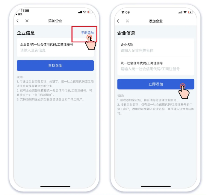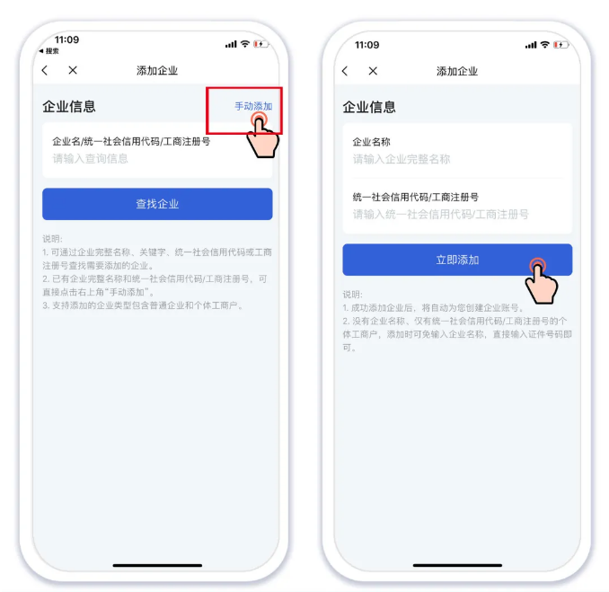 如无法通过查找方法添加企业,请点击右上角[手动添加],输入企业名称、统一社会信用代码/工商注册号进行添加。