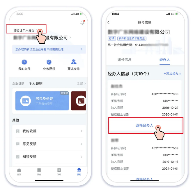 法定代表人/经营者可点击[我的]-[切换企业]查看企业账号,在该账号下添加经办人,邀请经办人刷脸认证,为其开通该企业账号的使用权限。