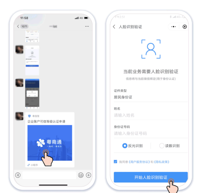 法定代表人/经营者注册个人账号的流程与经办人的一样,点击[人脸识别登录],打开“粤信签”小程序输入身份信息,完成人脸识别验证即可。