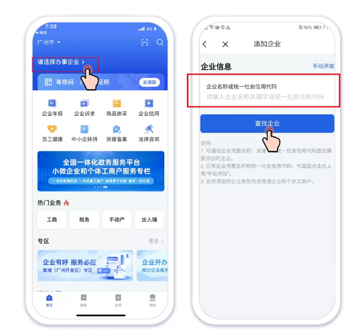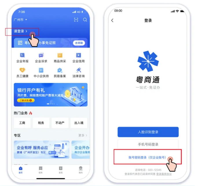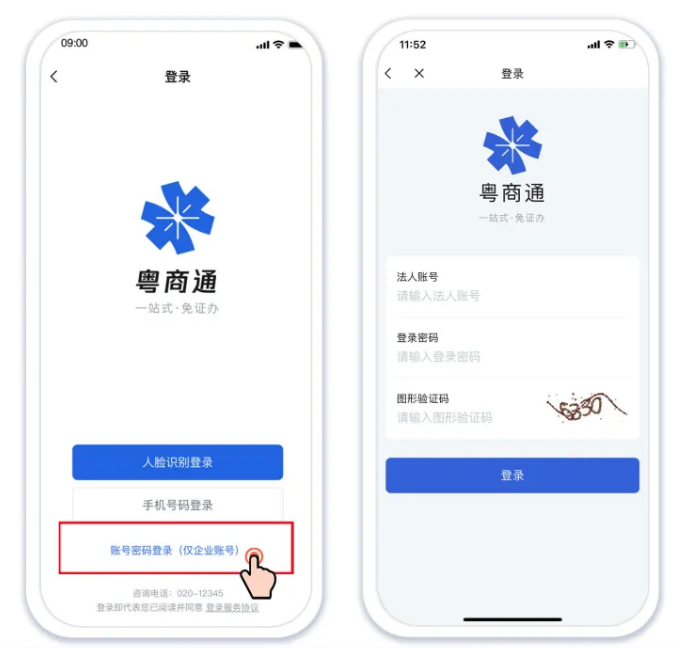 企业如已在广东省统一身份认证平台(注册渠道包括广东政务服务网及“粤信签”小程序)注册法人账号,可使用账号/密码登录”粤商通”APP。