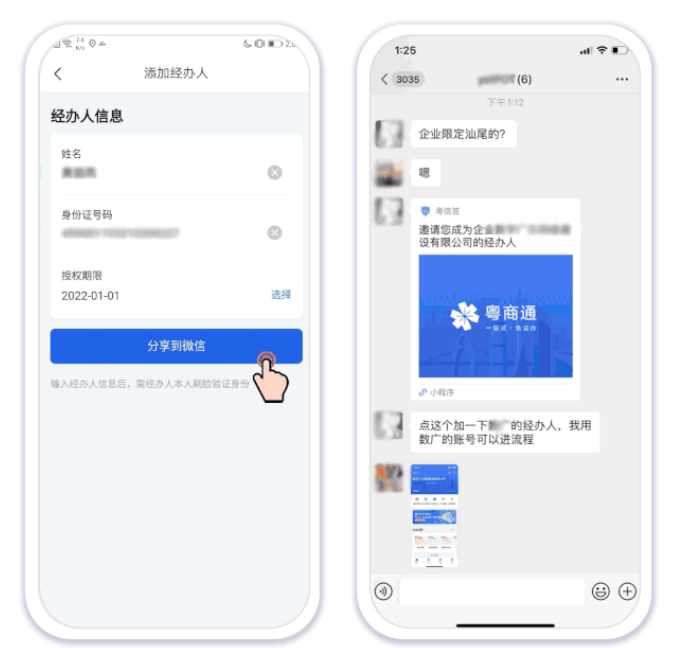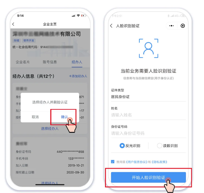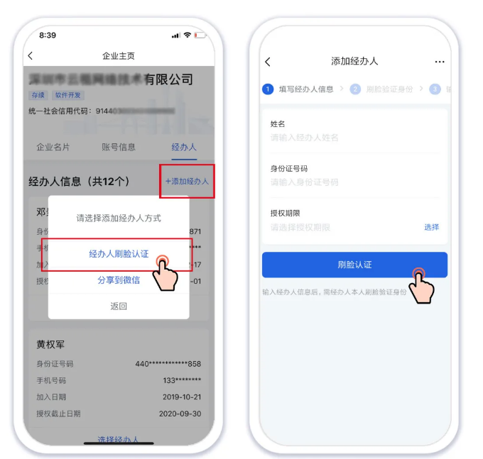 经办人可点击[我的]-[切换企业]查看企业账号,在该账号下添加其他经办人,邀请他们刷脸认证,为其开通该企业账号的使用权限。