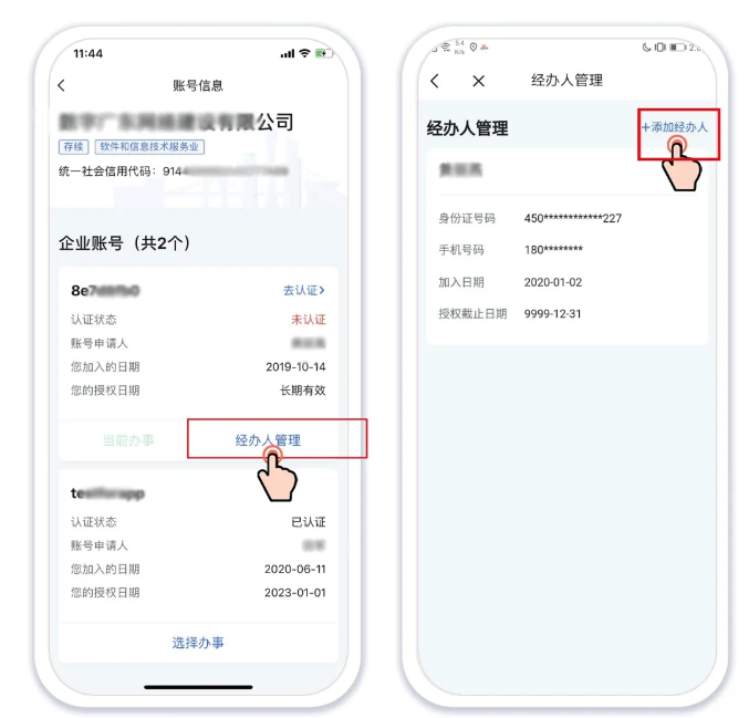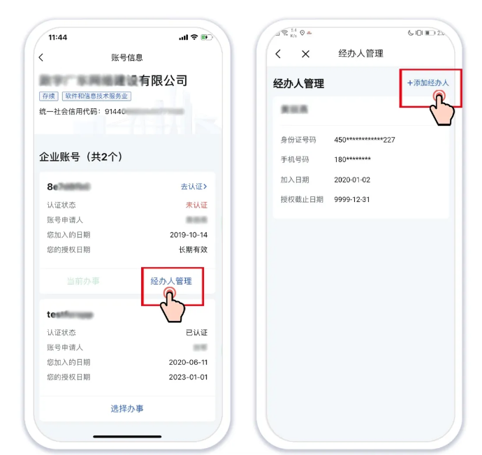 当前用户也可添加他人为经办人。添加成功后,经办人可获得该企业账户的使用权限。