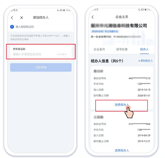 首次验证需要先添加经办人。添加成功后,经办人可获得该企业账户的使用权限。