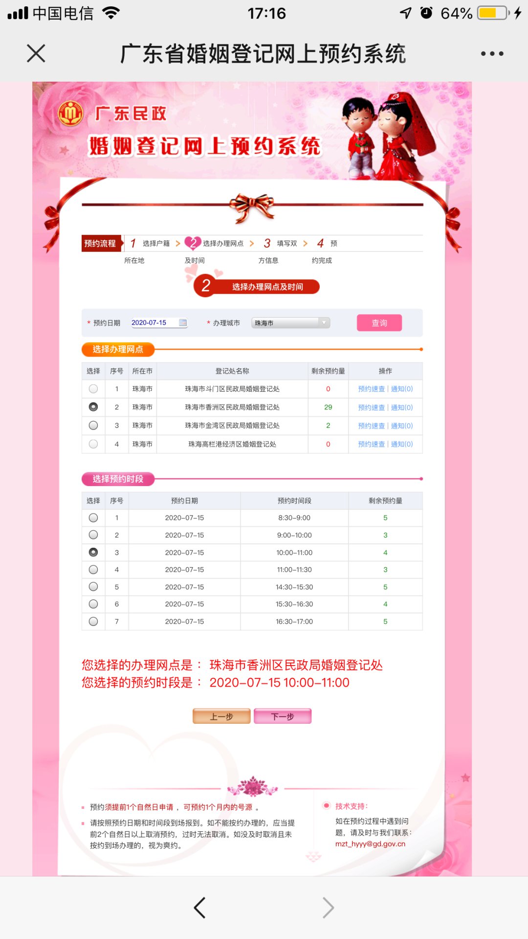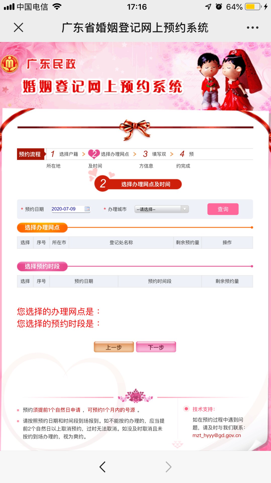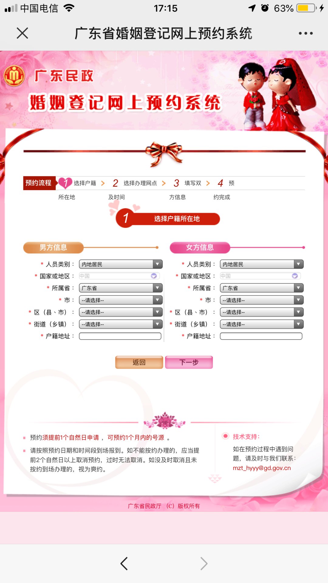 第三步:开始预约流程,填写男女双方户籍资料,点击【下一步】;