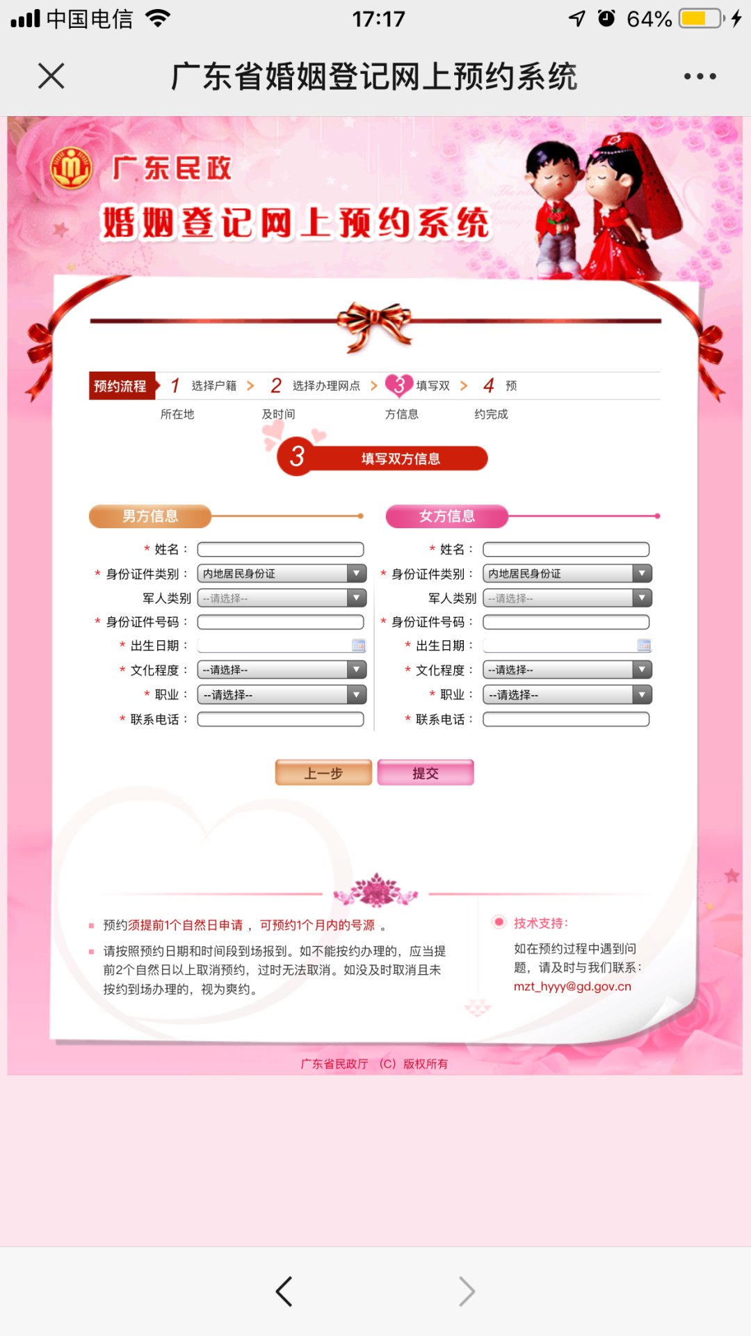 第五步:填写双方户籍信息点击【提交】,就预约成功啦!!