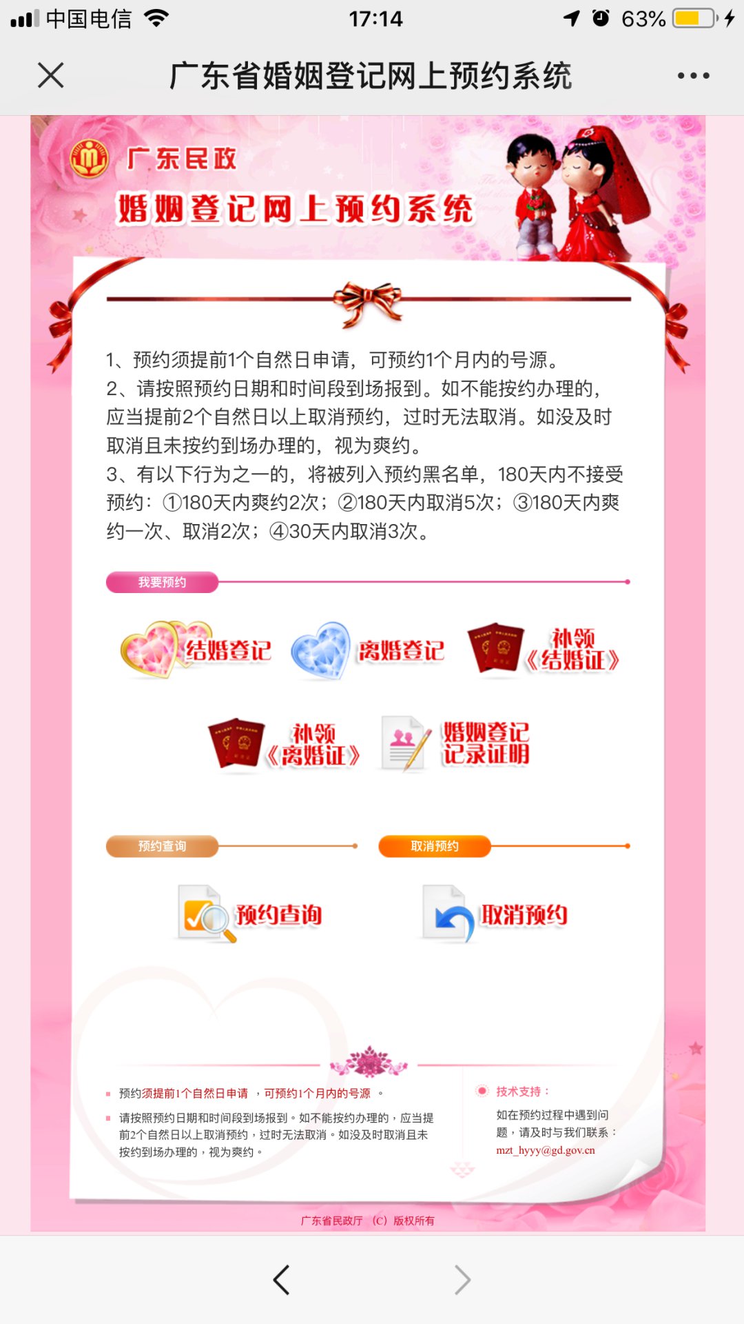 第二步:可预约服务包括婚姻登记、离婚登记、补领《结婚证》、补领《离婚证》、婚姻登记记录证明;同时还能进行预约查询及取消预约,我们来点击【离婚登记】看一看;