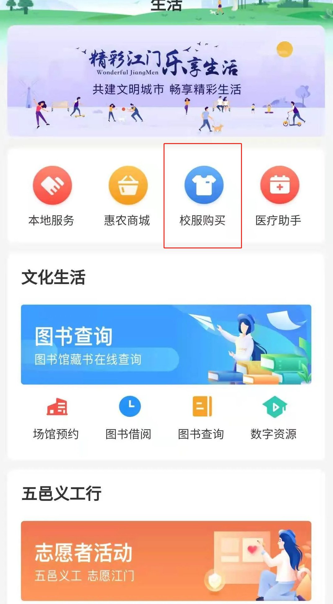 ①登录江门易办事APP,点击导航条“生活”即可点击进入“校服购买”服务专区;