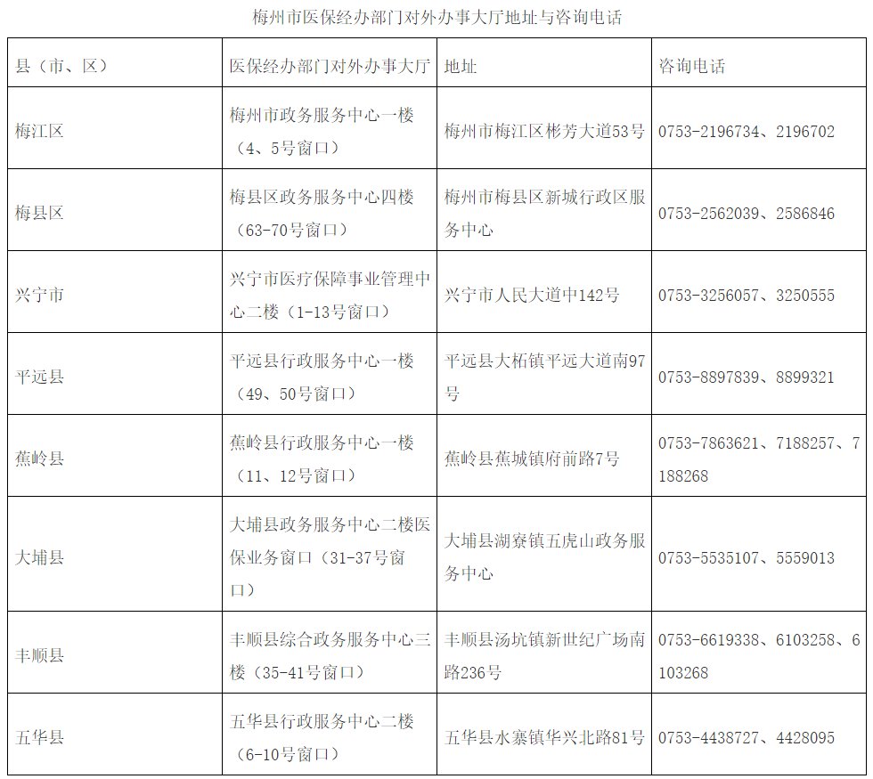 如有疑问可拨打 梅州市医保经办部门对外办事大厅咨询电话 进行咨询(点击可查看大图):