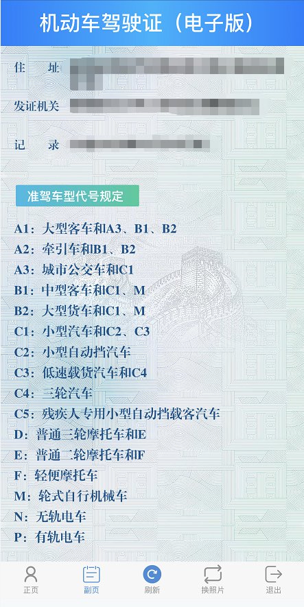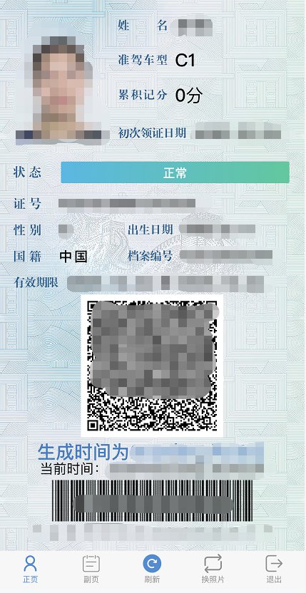 驾驶证基本信息,主要包括驾驶人照片、证号、姓名、性别、国籍、出生日期、初次领证日期、准驾车型、有效期限、累积记分、状态、证芯编号一维码、住址、发证机关、档案编号、当前时间、记录(包括准驾车型起始日期、校车准驾信息)、准驾车型对照表等内容。
