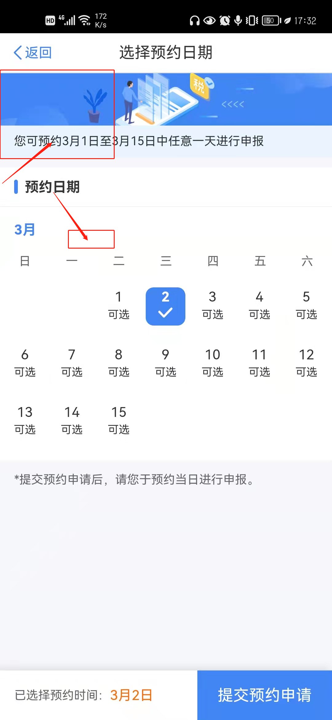 第二步:进入预约功能界面后,纳税人需仔细阅读提示内容,选择预约日期并提交,点击“开始预约”进入“选择预约日期”界面,选中标记为“可选”的日期后,点击底部“提交预约申请”按钮提交。