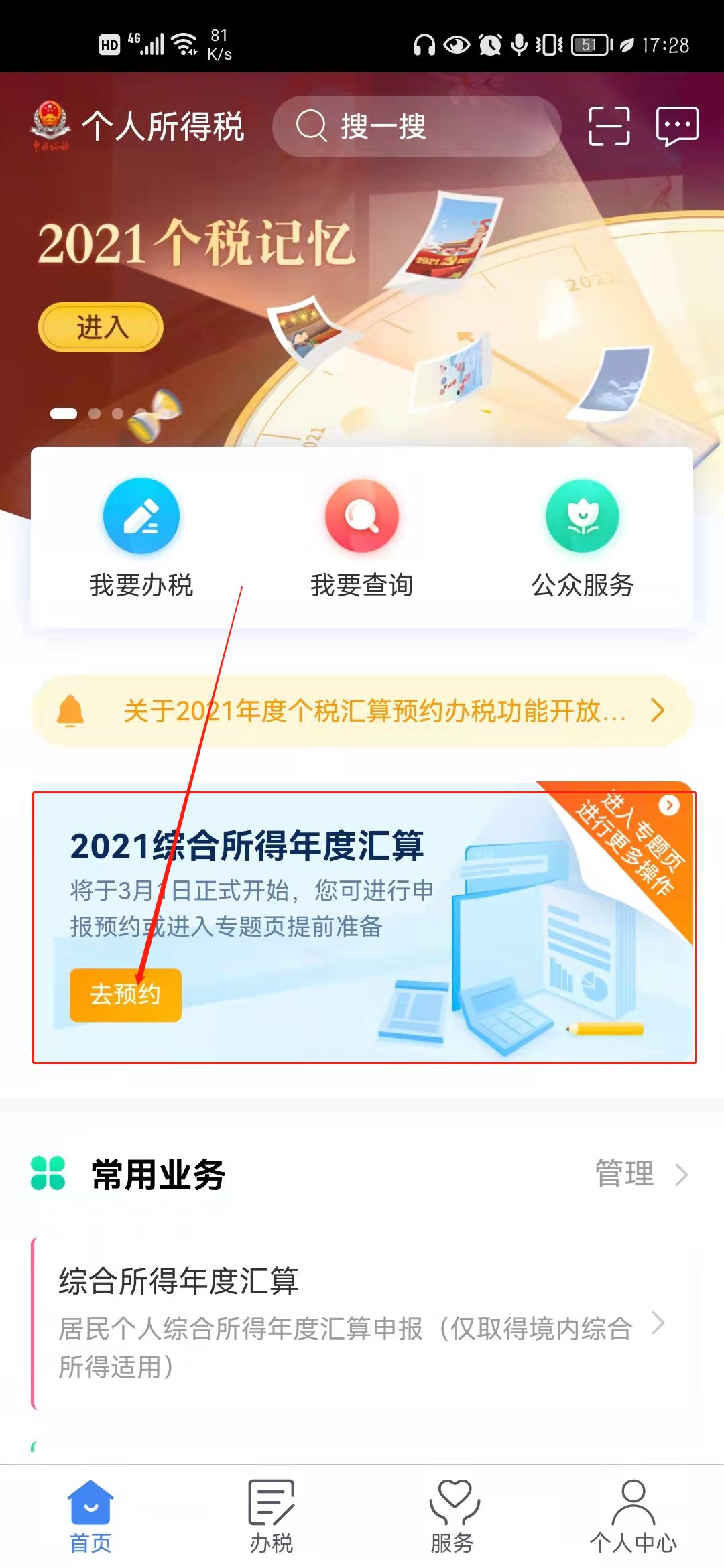 第一步:进入“个人所得税”手机APP预约功能页面,通过首页--2021综合所得年度汇算专题区域点击 “去预约”,进入预约功能页面。