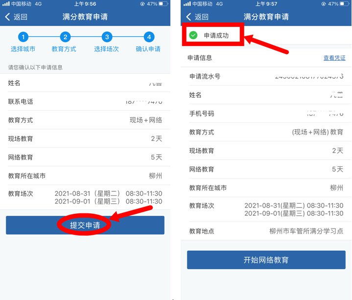 目前,在网上有两种方式申请满分教育学习,申请人可以通过“交管12123”手机APP或者登录广西交通安全综合服务管理平台。