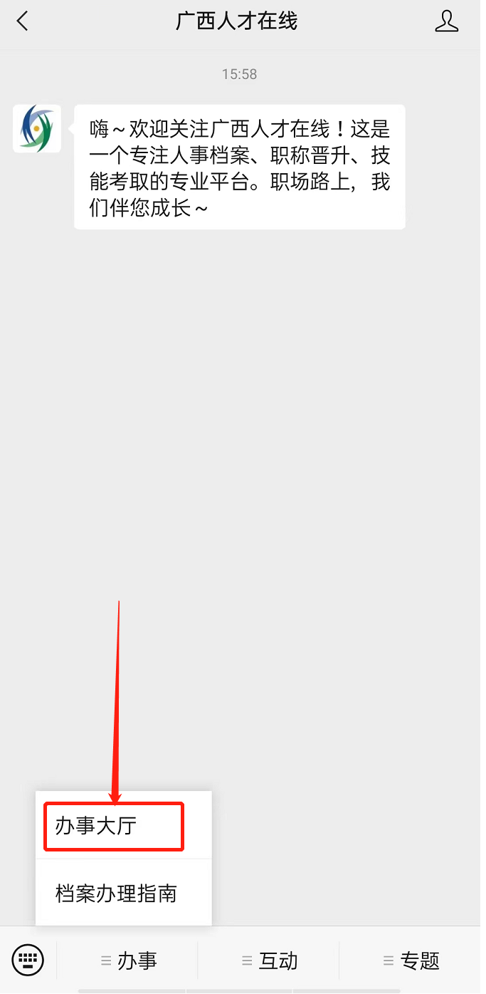 1.进入“广西人才在线”公众号,点击“办事”。