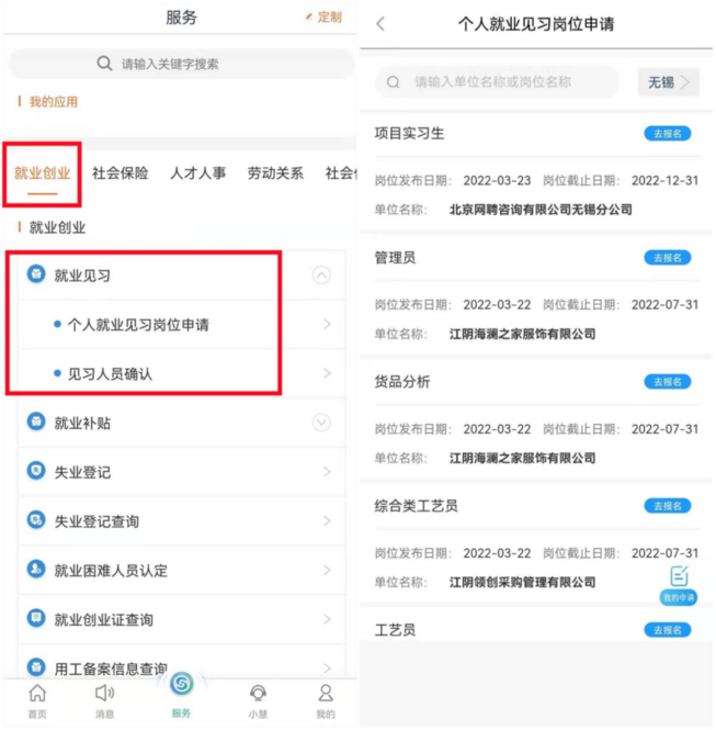 二、个人登录“江苏智慧人社”App,将登陆地切换为“无锡市”。进入“就业创业”-“个人就业见习岗位申请”