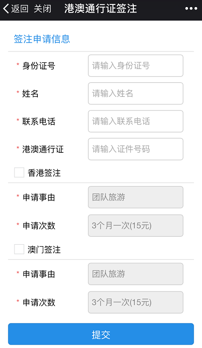 1.进入微信,按要求逐项填写后,选择签注类别次数,提交申请,等待审核。