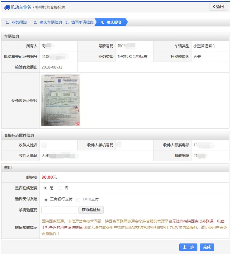 在该步骤,用户填写业务类型、申请原因、取件方式,对邮政寄递的选择邮寄地址,窗口自取的选择自取车管所等资料信息。如下图所示,确认后点击【下一步】按钮进入步骤4【确认提交】。