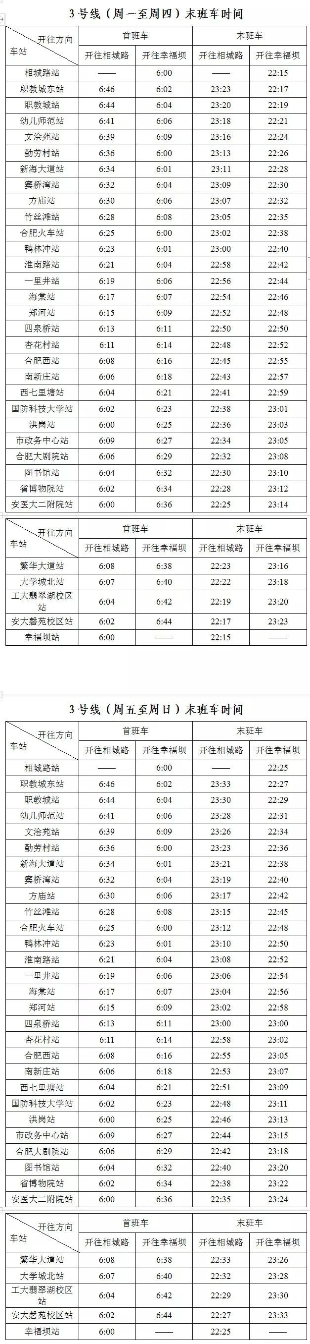 合肥地铁3号线各站点首末班发车时刻表