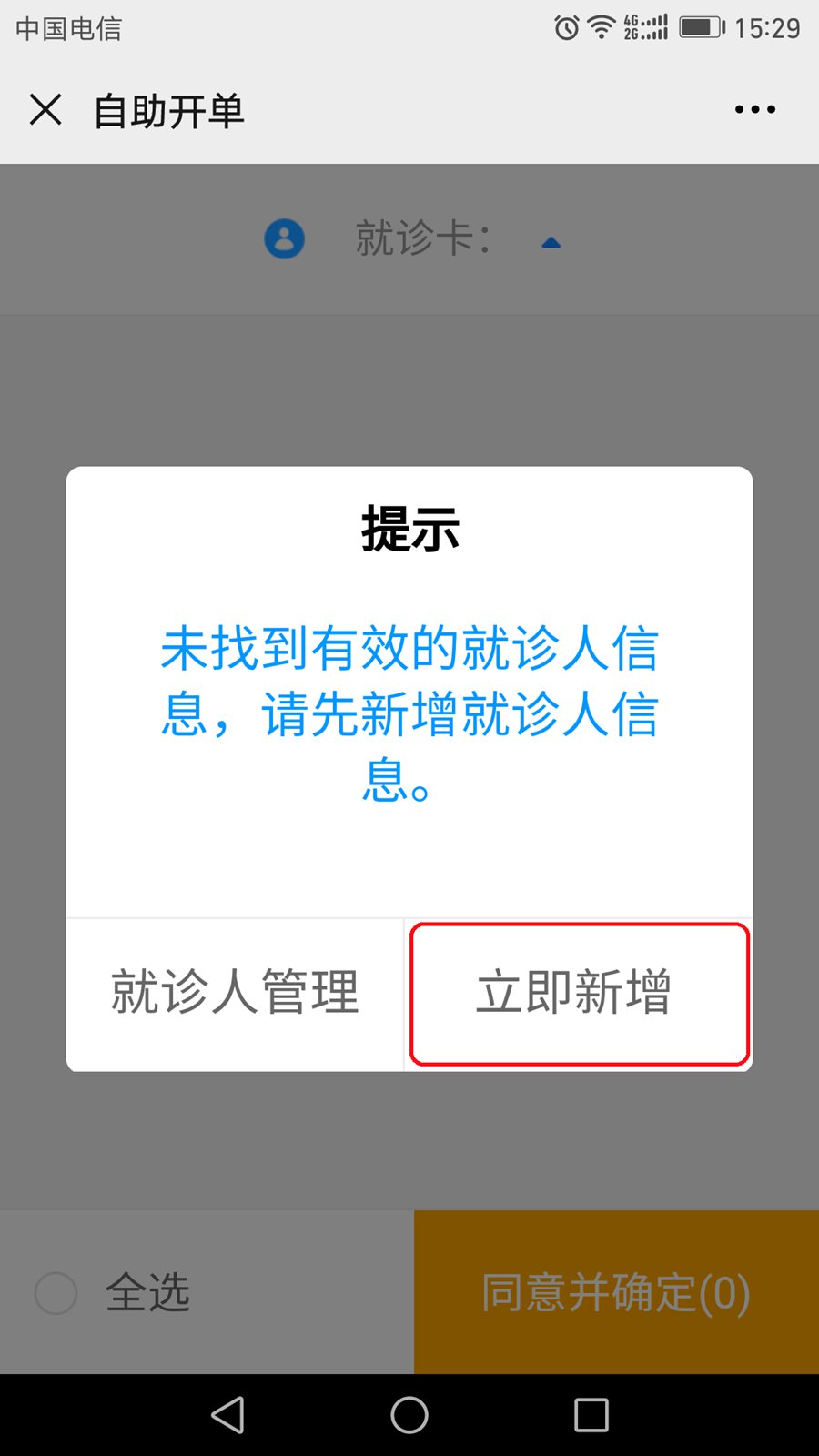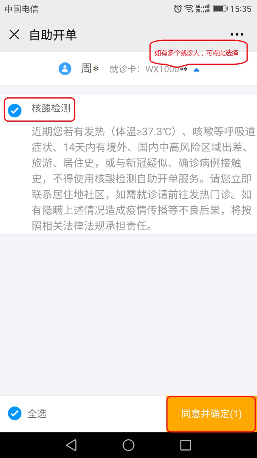 06添加完成后,首页点击“核酸自助开单”,进入如下界面。勾选“核酸检测”,点击“同意并确定”。