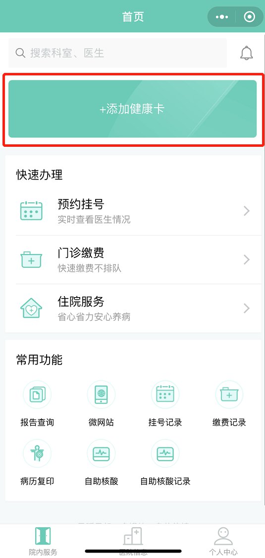 2.进入智慧医院首页后,点击“添加健康卡”