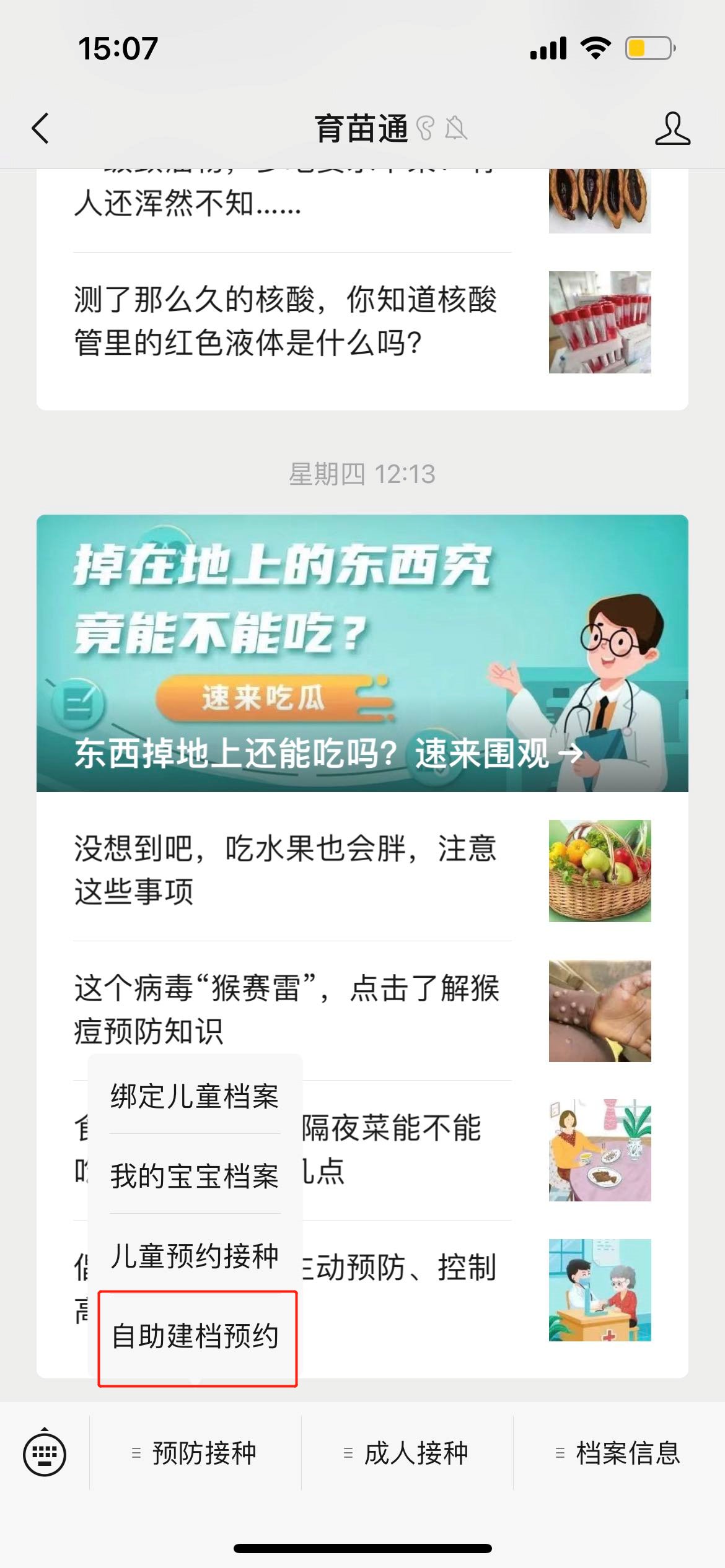 1.进入“育苗通”公众号,点击“菜单栏”——预防接种——自助建档预约。