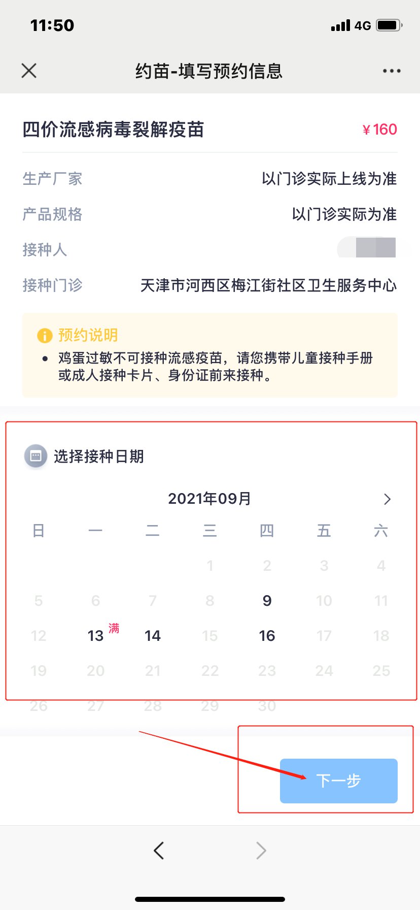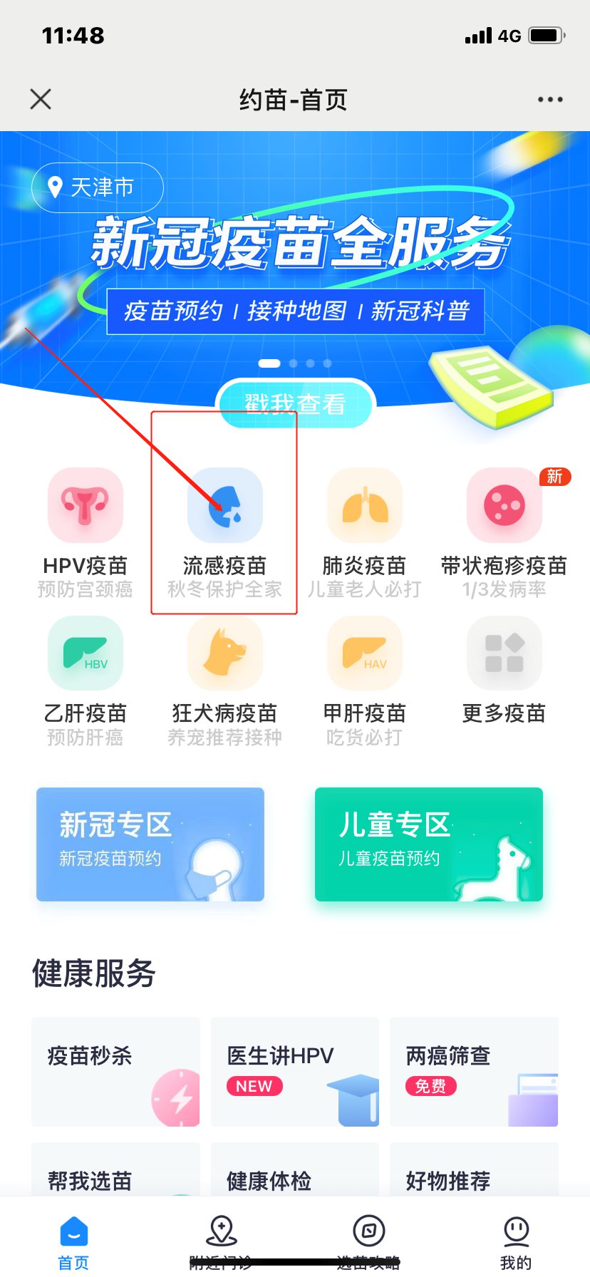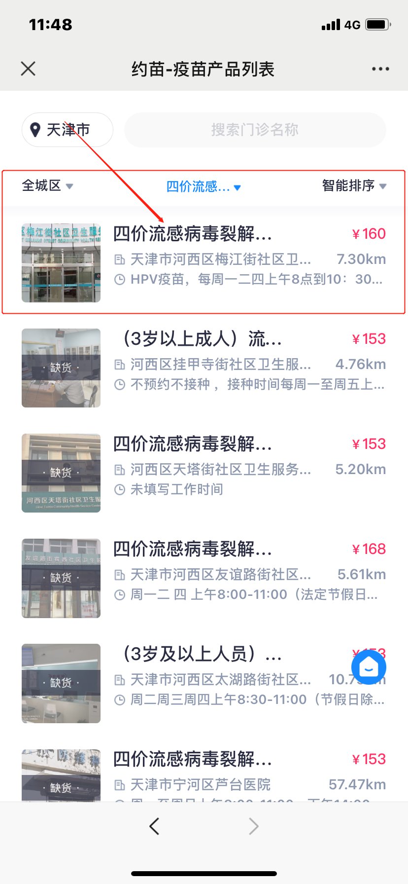 4、根据需求点击流感疫苗的种类,以“四价流感疫苗”为例