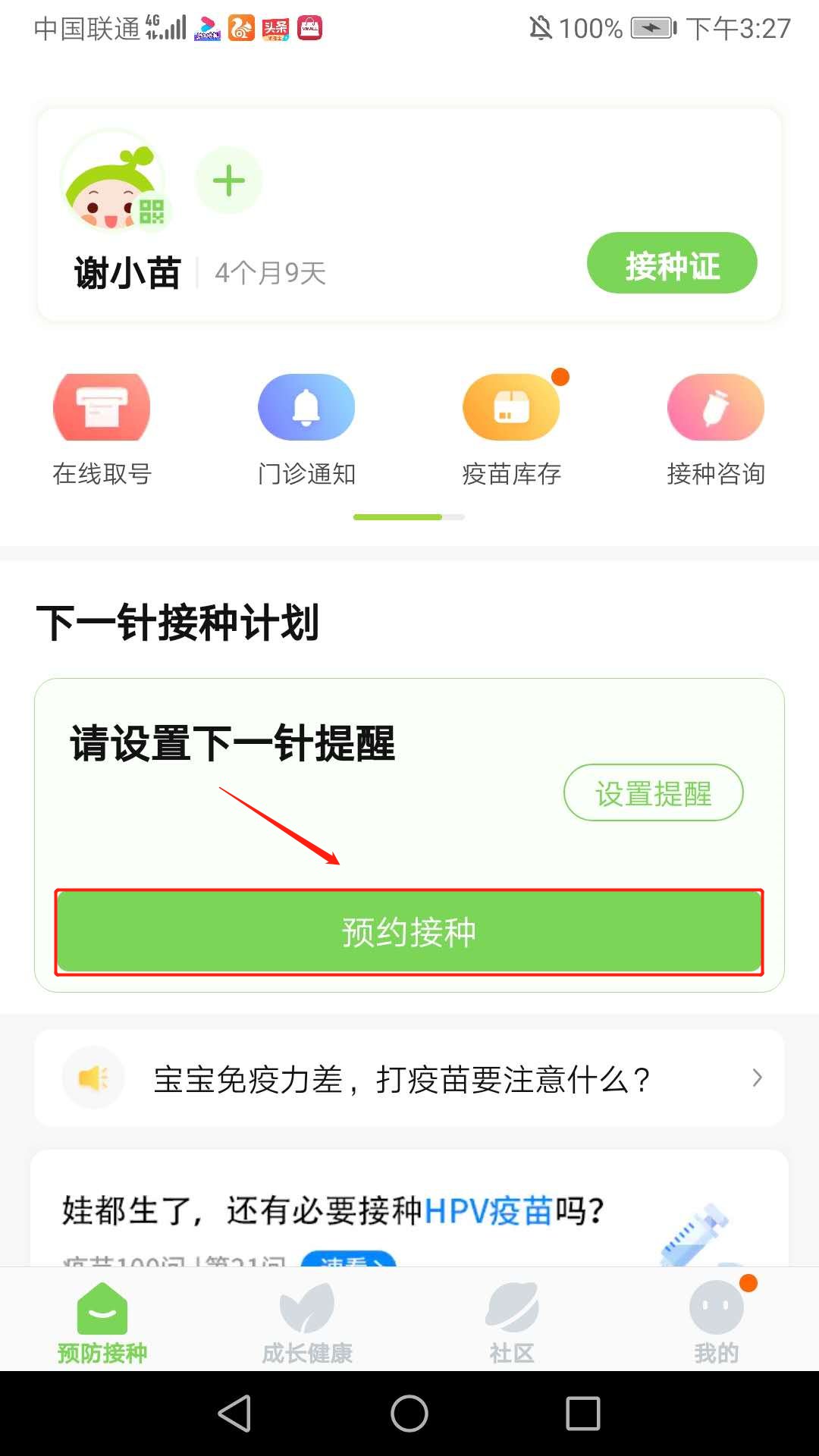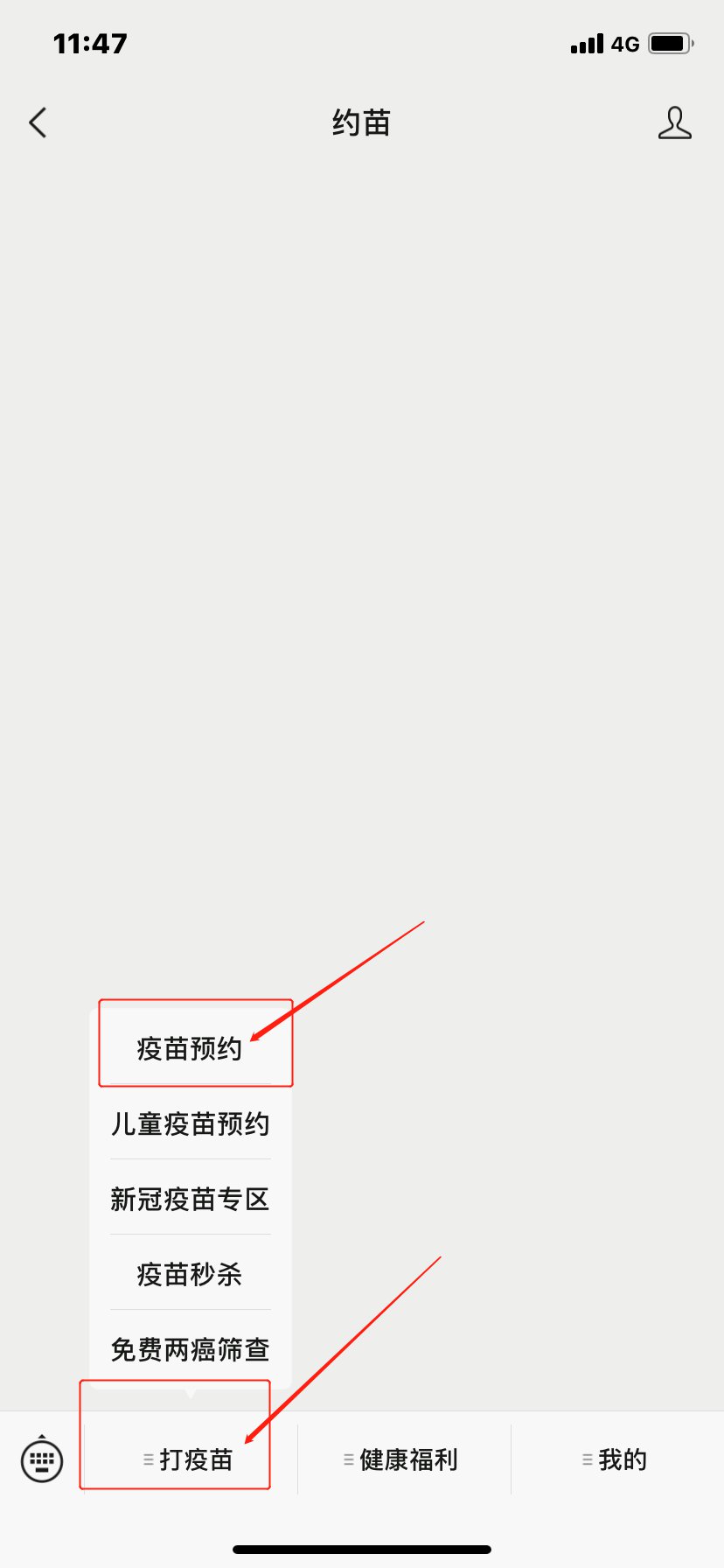 2、点击下方菜单栏“打疫苗”并点击“疫苗预约”